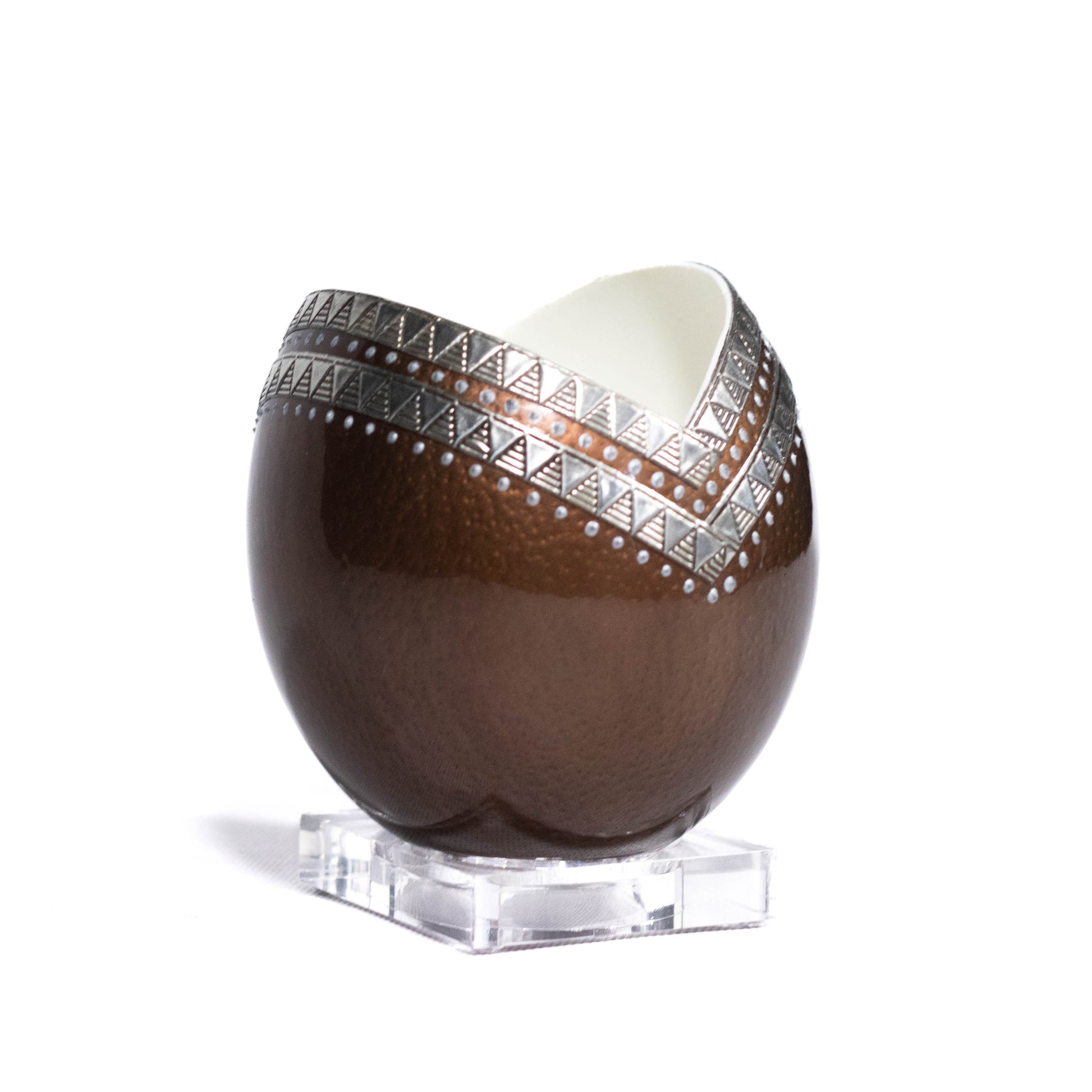 Creating an ostrich egg adorned with decoupage and pewter is a sophisticated art form that combines traditional decoupage techniques with the elegance of pewter accents. This fusion results in a unique decorative piece that showcases intricate designs and textures as displayed in this unique piece.