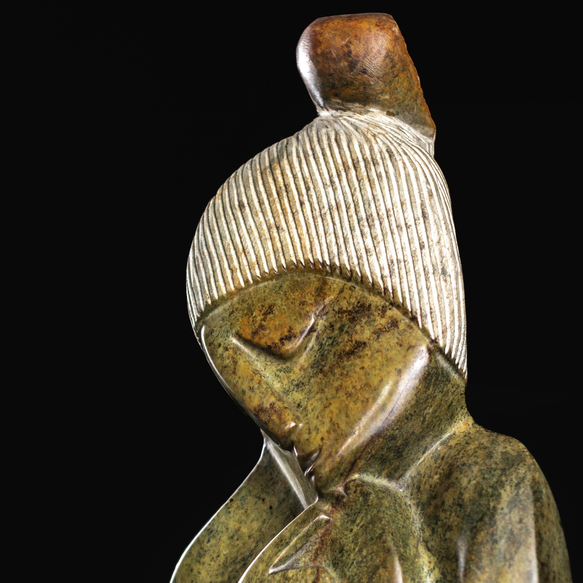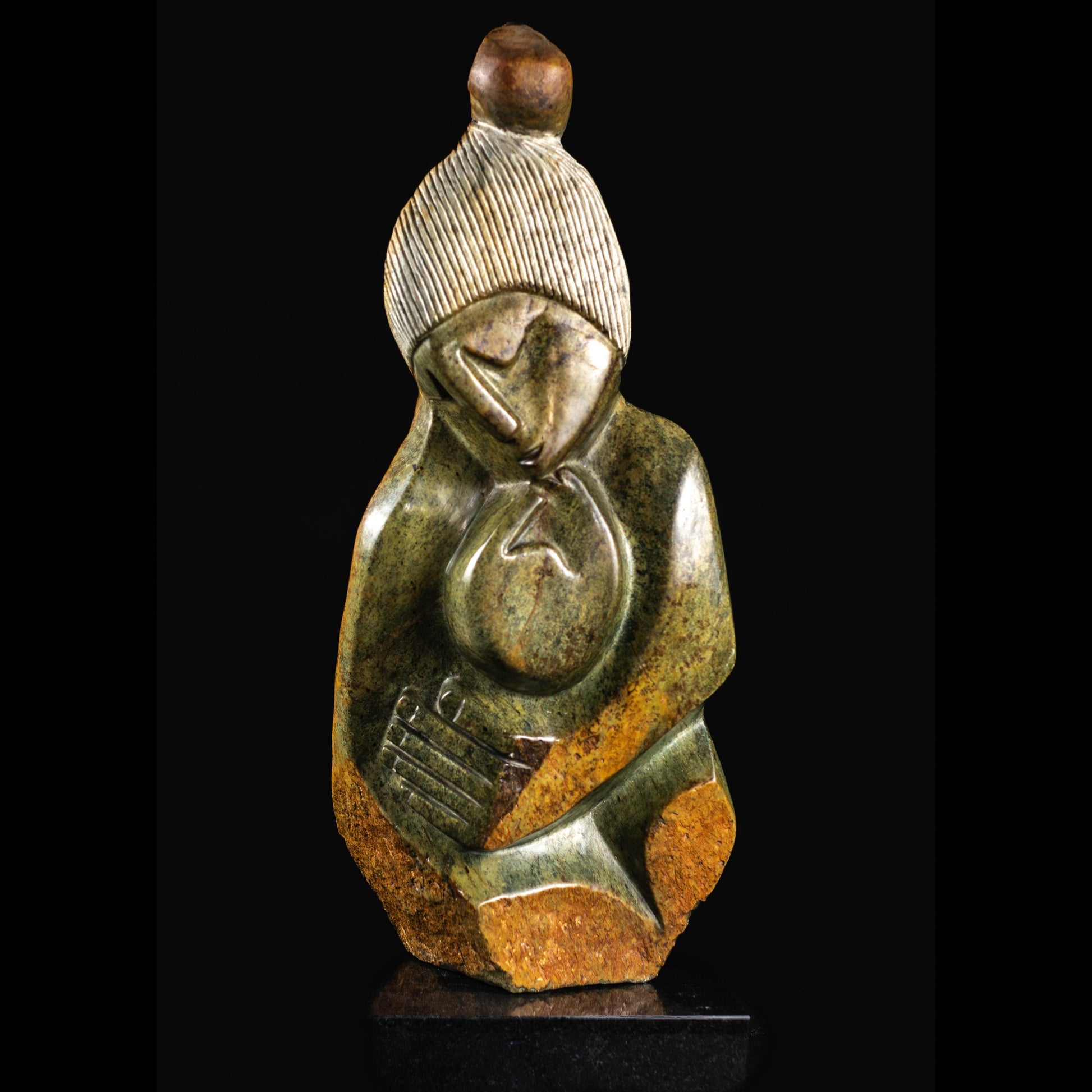 The artist used Serpentine stone to exhibit the theme of Family often found in Shona art. The abundance of orange colour found in this normally green stone makes it a rare piece. The green and gold patterns and colours of the stone make the work unique, no one sculpture is the same as another. The sculpture captures the essence of the special bond between mother and child and the importance of family in the Shona culture.